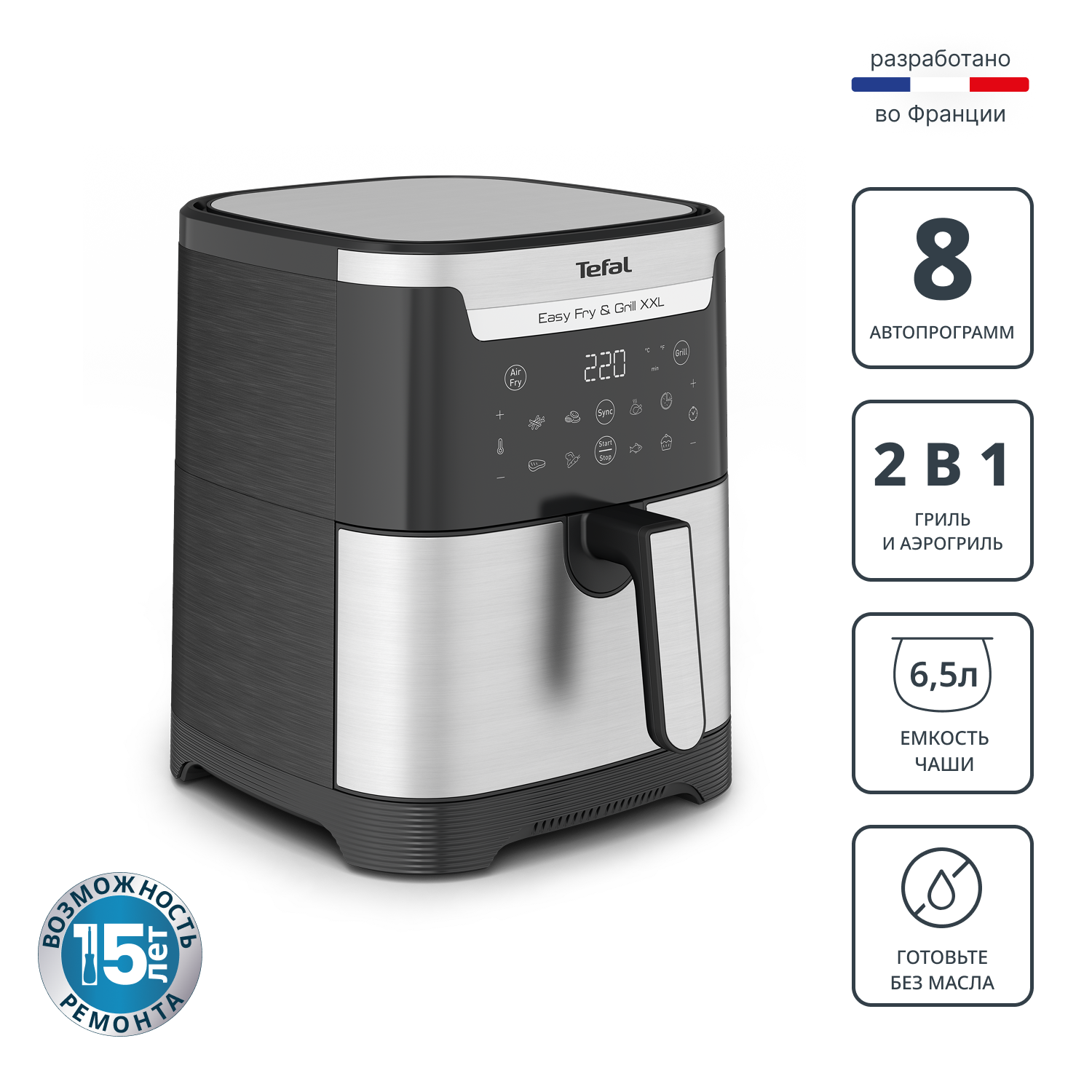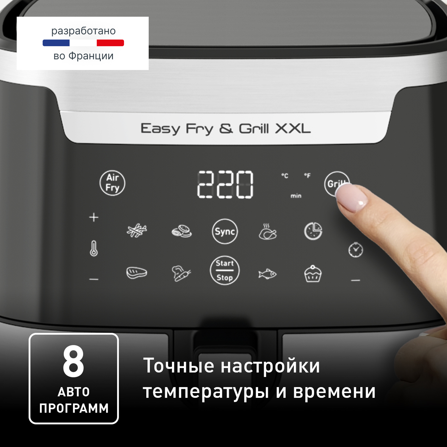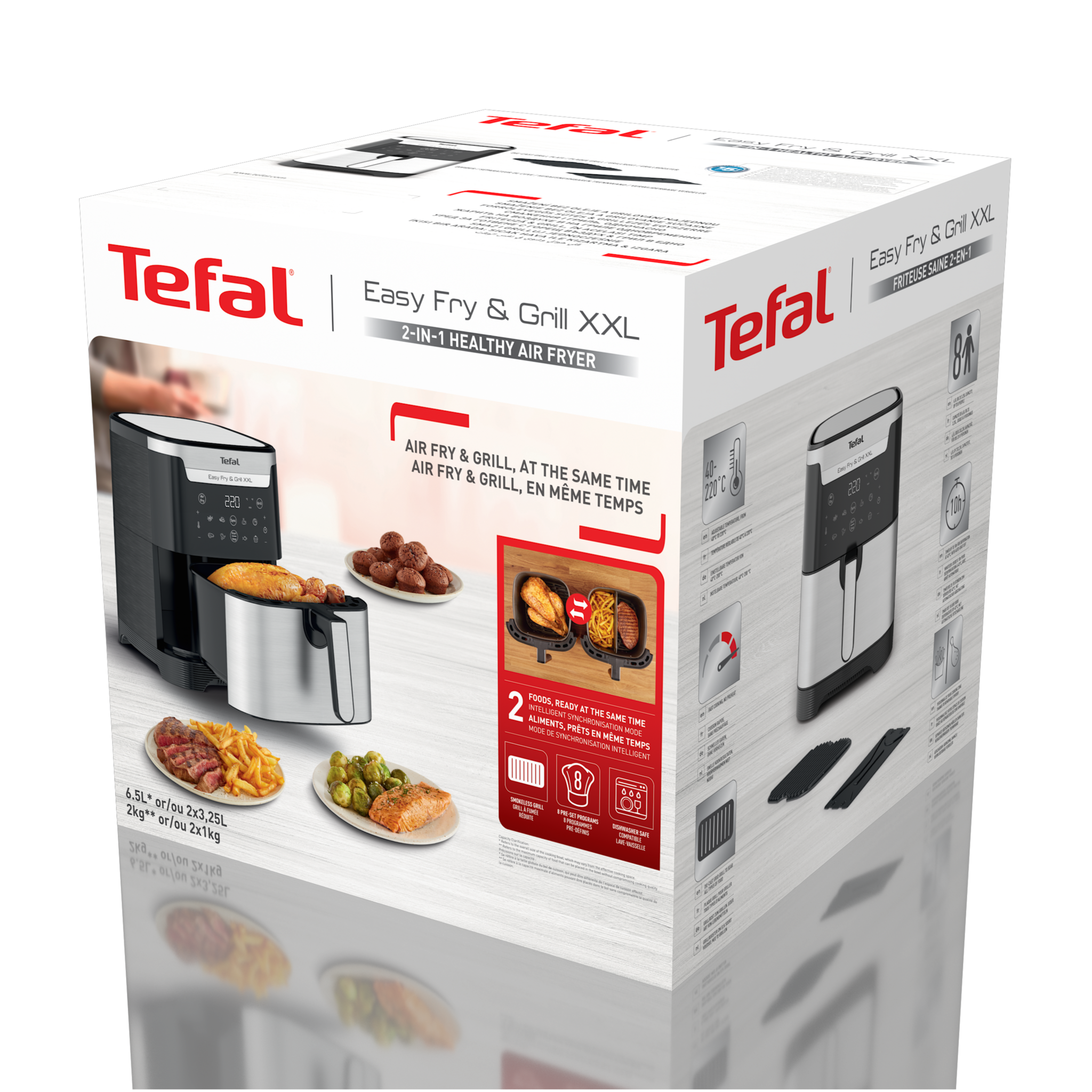 Устройство совмещает в себе две функции. Благодаря системе циркуляции горячего воздуха вы получите идеально хрустящую картошку фри, сочную курицу или запеченные овощи. А с помощью специальной решетки-гриль из литого алюминия легко приготовьте стейк или рыбу с красивыми полосками, как на открытом огне. Мощность 1830 Вт и температура до 220°C обеспечивают быстрое и равномерное приготовление.