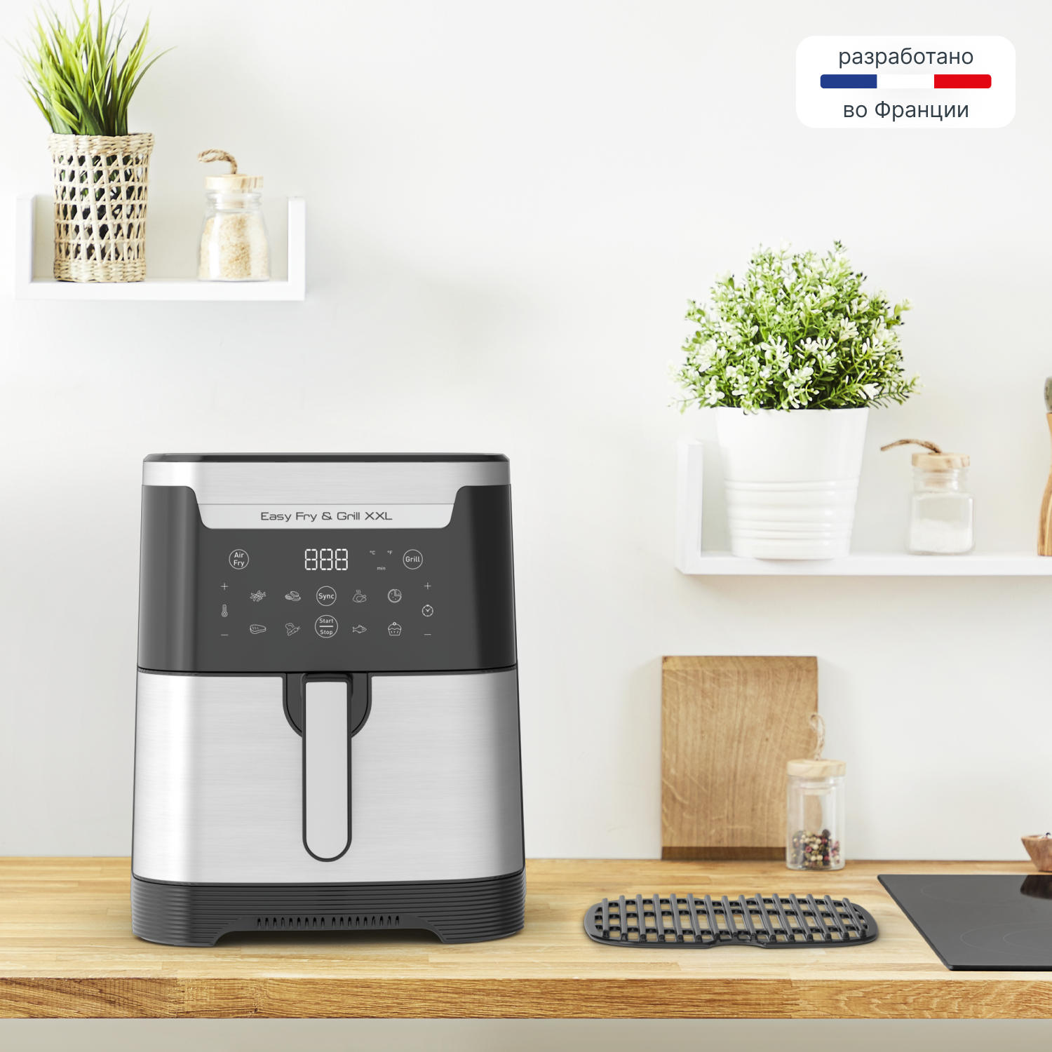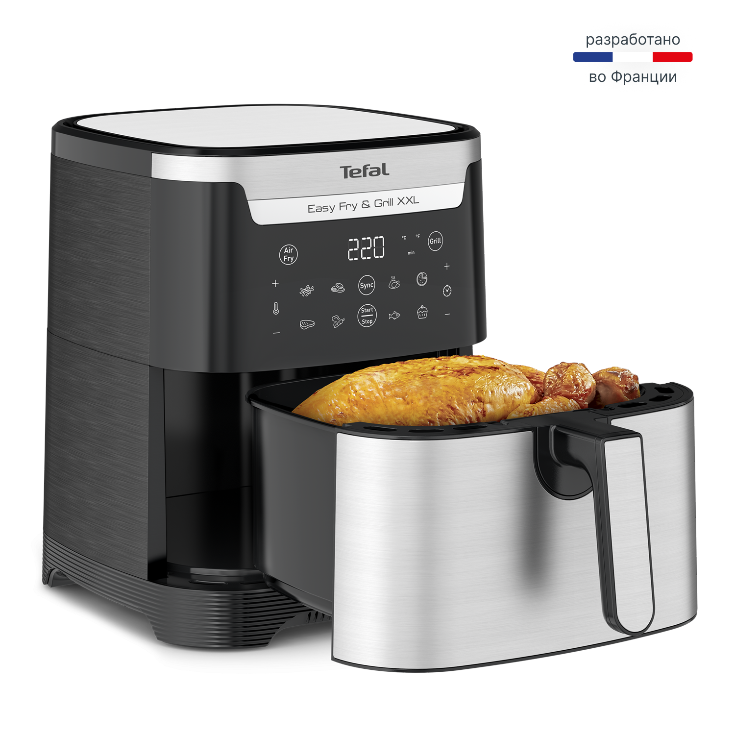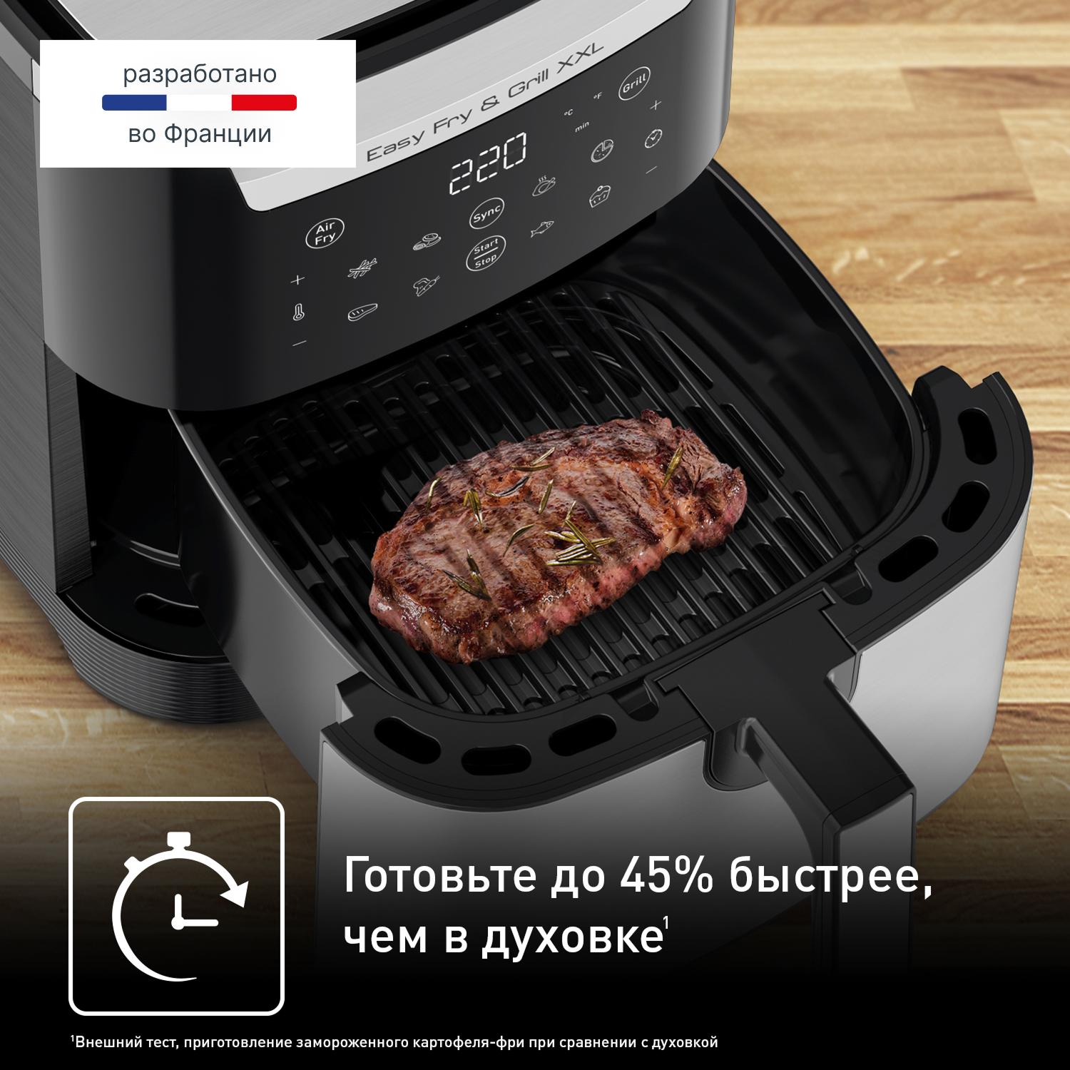 Устройство совмещает в себе две функции. Благодаря системе циркуляции горячего воздуха вы получите идеально хрустящую картошку фри, сочную курицу или запеченные овощи. А с помощью специальной решетки-гриль из литого алюминия легко приготовьте стейк или рыбу с красивыми полосками, как на открытом огне. Мощность 1830 Вт и температура до 220°C обеспечивают быстрое и равномерное приготовление.
