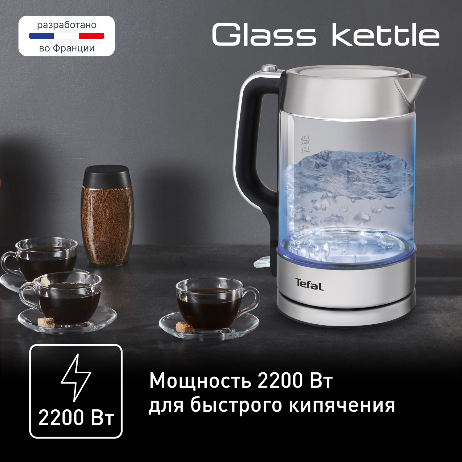 Чайник Tefal Glass KI770D30 — простая в применении и надежная модель, резервуар которой изготовлен из прочного термостойкого стекла, обрамленного нержавеющей сталью, что обеспечивает максимальное сохранение пищевых свойств воды. Дисковый нагреватель способствует быстрому кипячению. Уход за плоской пластиной нагревательного элемента и гладкой поверхностью внутренних стенок максимально прост. Для осуществления визуального контроля наполнения резервуара объемом 1,7 л и состояния жидкости предусмотрена яркая подсветка. Чайник Tefal Glass KI770D30 оснащен откидной крышкой, которая легко открывается одним движением при помощи специальной кнопки, расположенной на ручке. Для точного наполнения емкости предусмотрена мерная шкала, нанесенная на корпус, с обозначениями предельных и промежуточных значений количества жидкости. Функция автоматического отключения поможет избежать перегрева системы и продлить срок эксплуатации устройства.