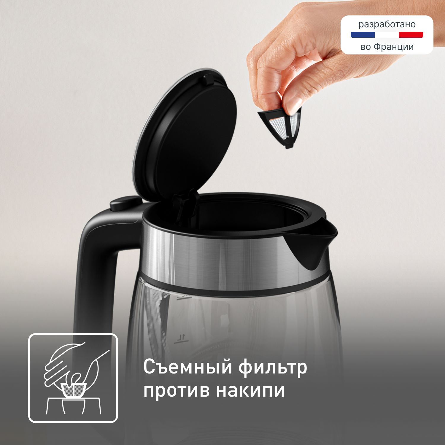 Регулярно удаляйте накипь, желательно раз в месяц, и чаще, если вы проживаете в регионе с высокой степенью жесткости воды.Удаление накипи из чайника:• Используйте имеющийся в продаже 8%-ный белый уксус:- Налейте в чайник 0,5 л уксуса;- Оставьте на 1 час (не нагревать).• Лимонная кислота:- Вскипятите 0,5 л воды;- Добавьте 25 г лимонной кислоты и оставьте на 15 минут.• Специальное средство, удаляющее накипь, для пластиковых чайников: следуйте инструкциям производителя.Вылейте содержимое из чайника и ополосните его 5–6 раз.При необходимости повторите.Удаление накипи с фильтра (в зависимости от модели):• Погрузите фильтр в белый уксус или в раствор лимонной кислоты.• Не используйте для удаления накипи способы, не соответствующие рекомендуемому.