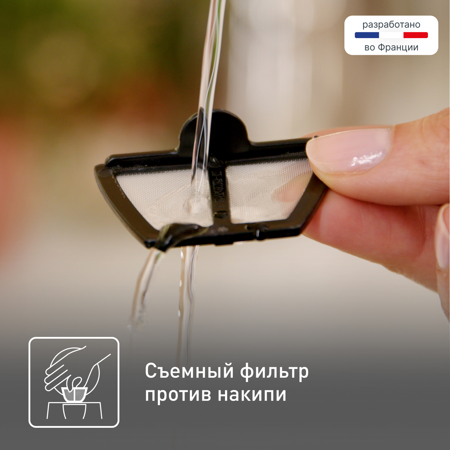 Регулярно удаляйте накипь, желательно раз в месяц, и чаще, если вы проживаете в регионе с высокой степенью жесткости воды. Удаление накипи из чайника: Используйте имеющийся в продаже 8%-ный белый уксус: - Налейте в чайник 0,5 л уксуса; - Оставьте на 1 час (не нагревать). Лимонная кислота: - Вскипятите 0,5 л воды; - Добавьте 25 г лимонной кислоты и оставьте на 15 минут. Специальное средство, удаляющее накипь, для пластиковых чайников: следуйте инструкциям производителя. Вылейте содержимое из чайника и ополосните его 5–6 раз. При необходимости повторите. Удаление накипи с фильтра (в зависимости от модели): Погрузите фильтр в белый уксус или в раствор лимонной кислоты. Не используйте для удаления накипи способы, не соответствующие рекомендуемому.