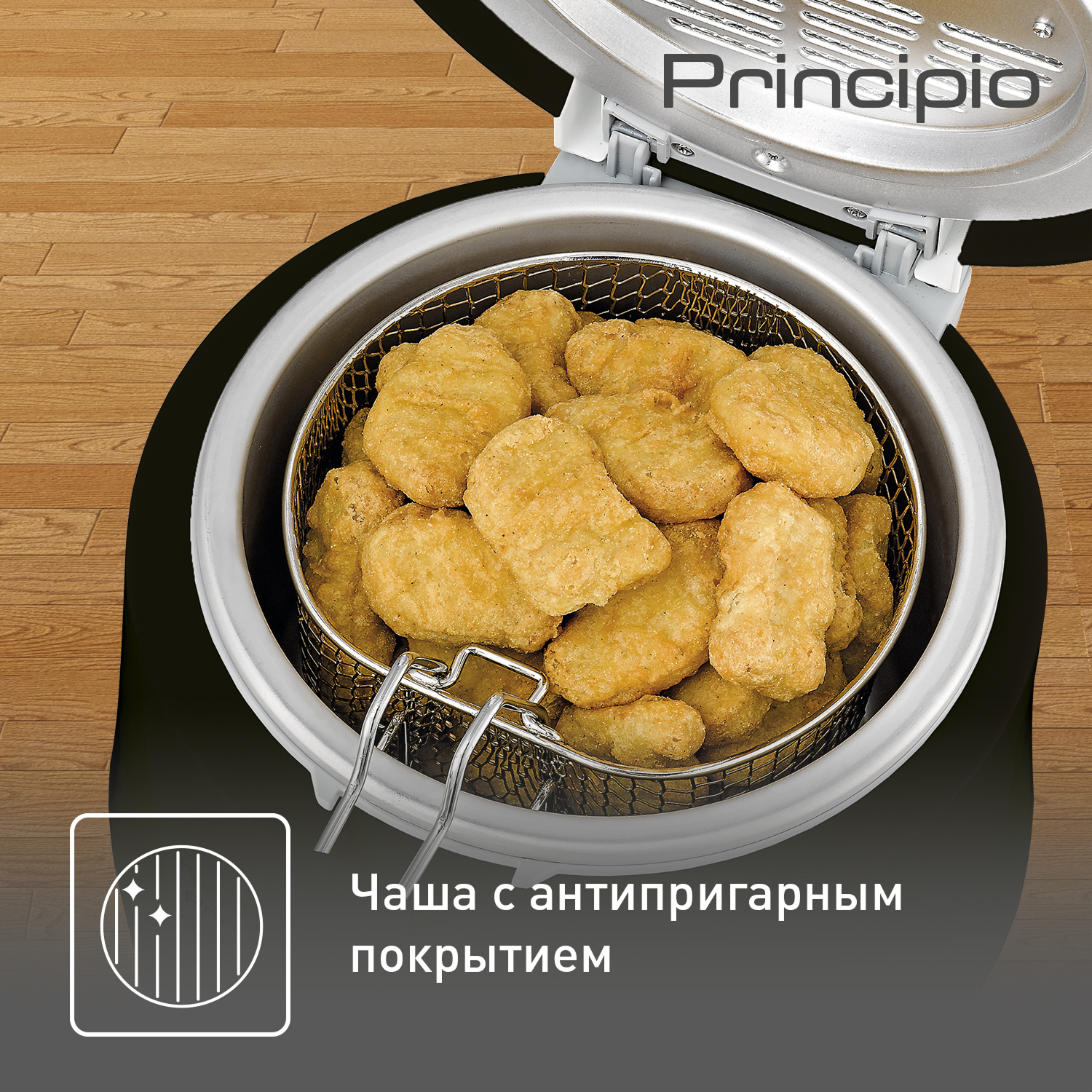 Хороший объём, жарит равномерно. Крышка с окном — удобно наблюдать. Простая и мощная.