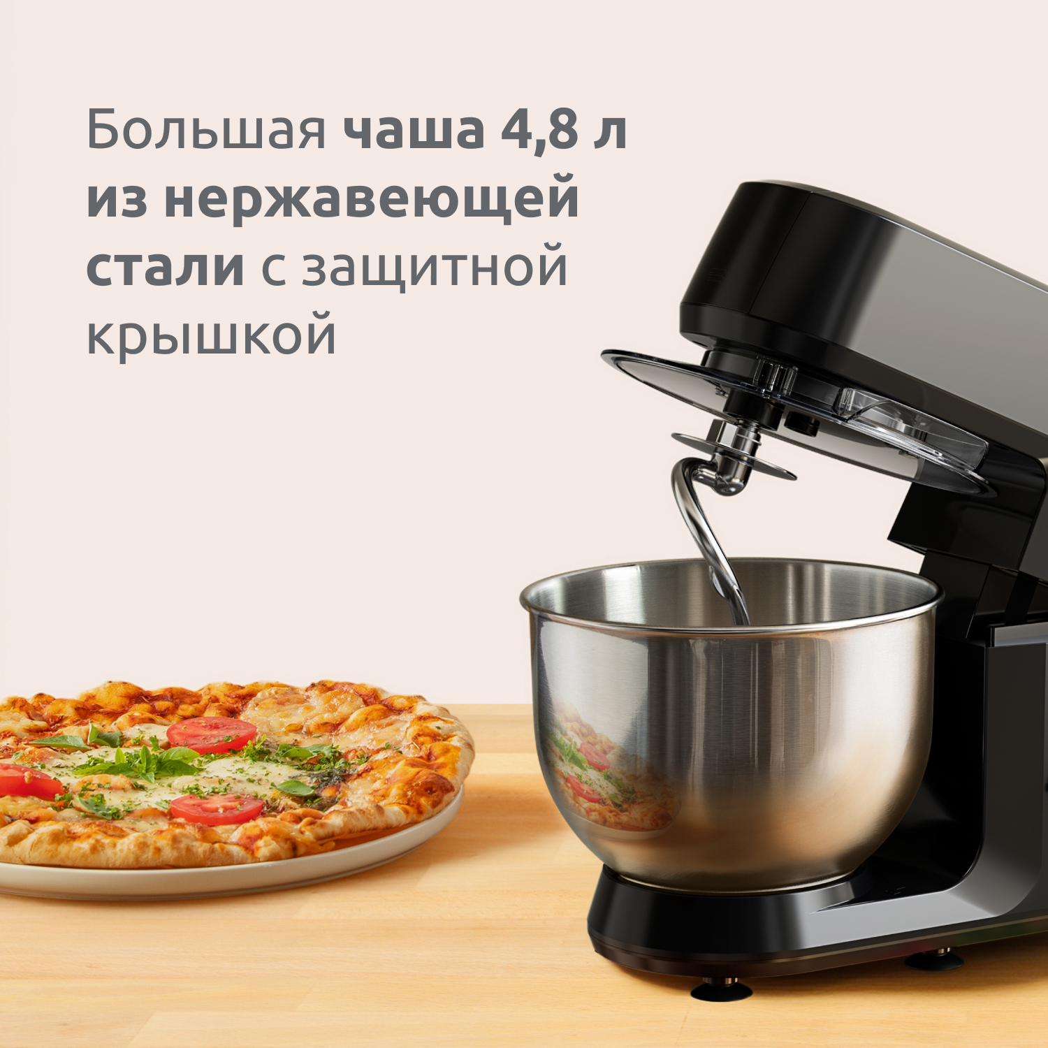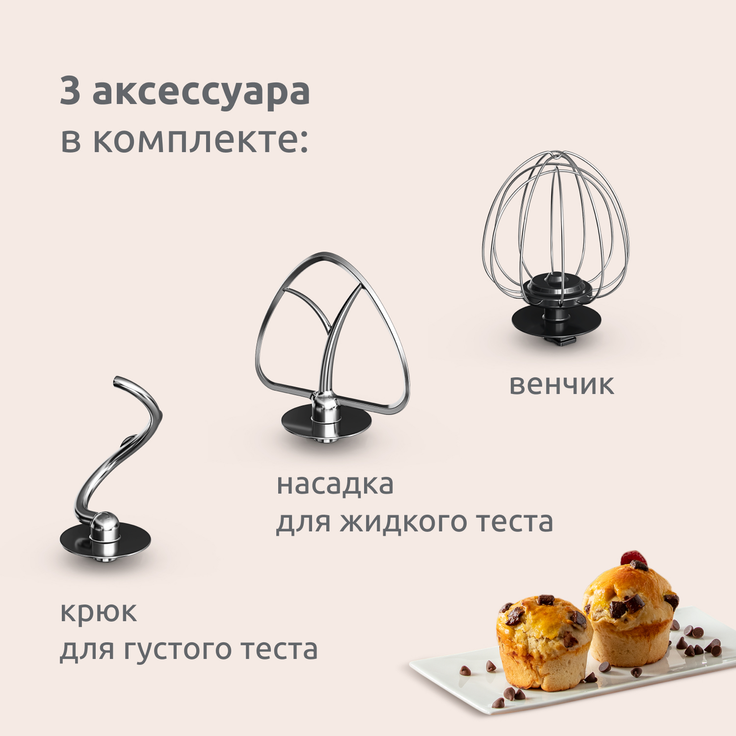 Обеспечивает стабильную и надёжную работу, позволяя без усилий взбивать, перемешивать и замешивать даже плотное тесто.