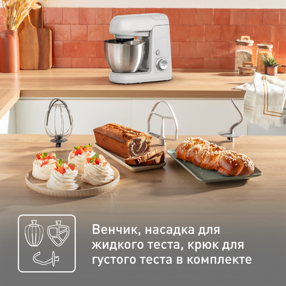 • Насадки: Блендер, венчик, битер для перемешивания, крюк для теста