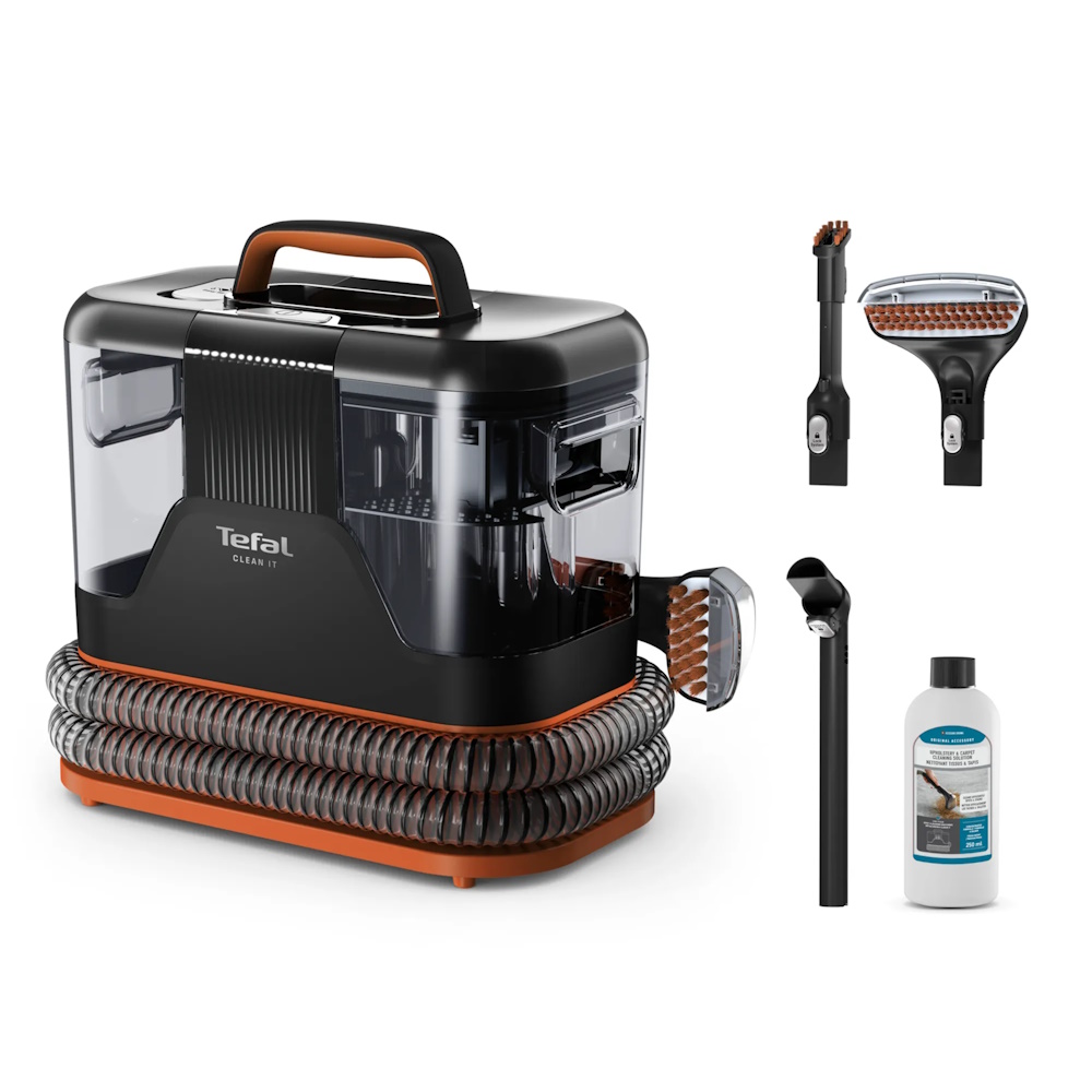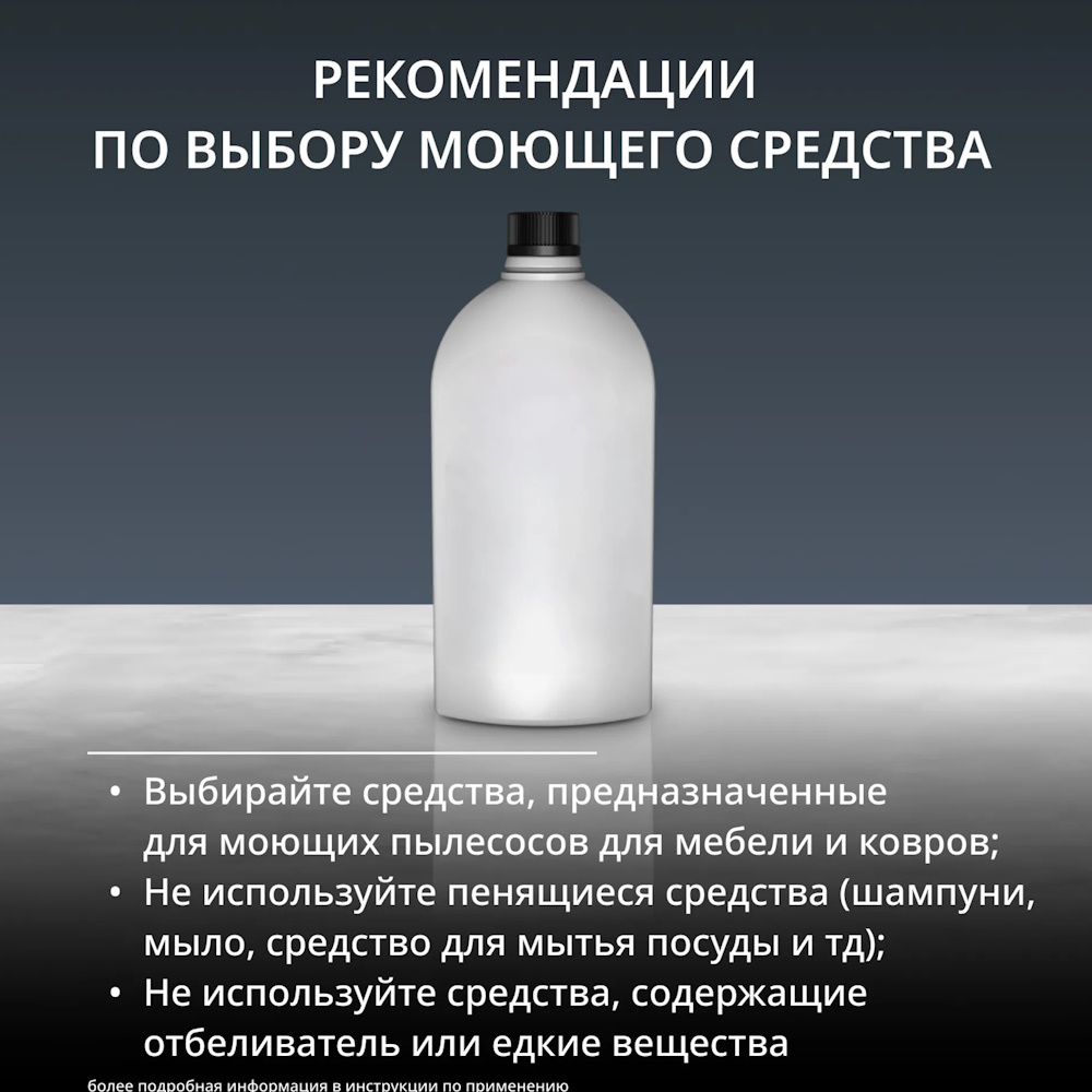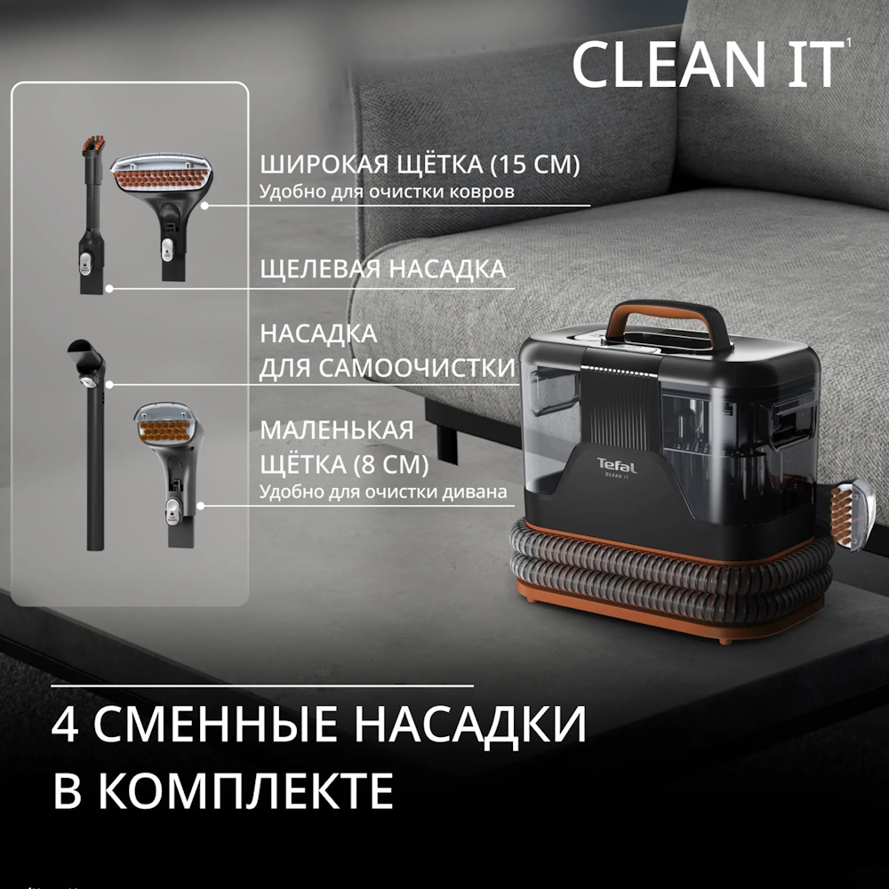 Маленькая щетка 8см, большая щетка 15 см, щелевая насадка, насадка для самоочистки, 250 мл средство для мебели и ковров