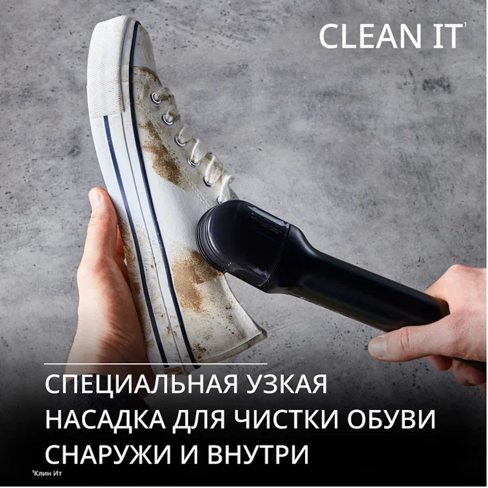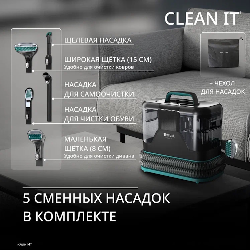 Моющий пылесос Tefal Clean It IZ5020F0 создан для тех, кто хочет поддерживать безупречную чистоту мягкой мебели, ковров и текстильных поверхностей прямо у себя дома. Компактная и эргономичная модель сочетает мощность, удобство и продуманную функциональность, превращая обычную уборку в эффективную домашнюю химчистку. Мощный двигатель 750 Вт обеспечивает силу всасывания 13 500 Па, благодаря чему пылесос глубоко очищает поверхности от пыли, пятен, шерсти домашних животных и аллергенов. Технология серии Tefal Clean It работает по простому и эффективному принципу из трёх этапов: сначала распыляется чистящий раствор, затем щетка бережно обрабатывает поверхность, после чего мощное всасывание удаляет грязь и влагу, оставляя ткань свежей и чистой. Для удобной влажной уборки пылесос оснащён двумя резервуарами: контейнером для чистой воды объёмом 2,3 литра и резервуаром для грязной воды на 1,5 литра, что позволяет проводить длительную уборку без частых остановок. Компактные размеры и небольшой вес (5,1 кг) делают устройство удобным в переноске и хранении. Особенность модели — функция самоочистки, которая помогает поддерживать систему в идеальном состоянии после каждой уборки. В комплекте предусмотрено 5 насадок, включая большую щётку 15 см, компактную щётку 8 см, щелевую насадку, специальную насадку для чистки обуви, а также насадку для самоочистки. Дополнительно в набор входит специальное моющее средство и удобный чехол для хранения аксессуаров. Благодаря продуманной конструкции и универсальному набору насадок Tefal Clean It IZ5020F0 легко справляется с очисткой диванов, кресел, ковров, автомобильных сидений и других текстильных поверхностей, обеспечивая профессиональный результат в домашних условиях. Моющий пылесос Tefal Clean It IZ5020F0 — это компактное решение для глубокой чистки мебели и ковров, которое возвращает вашему дому свежесть и идеальную чистоту.