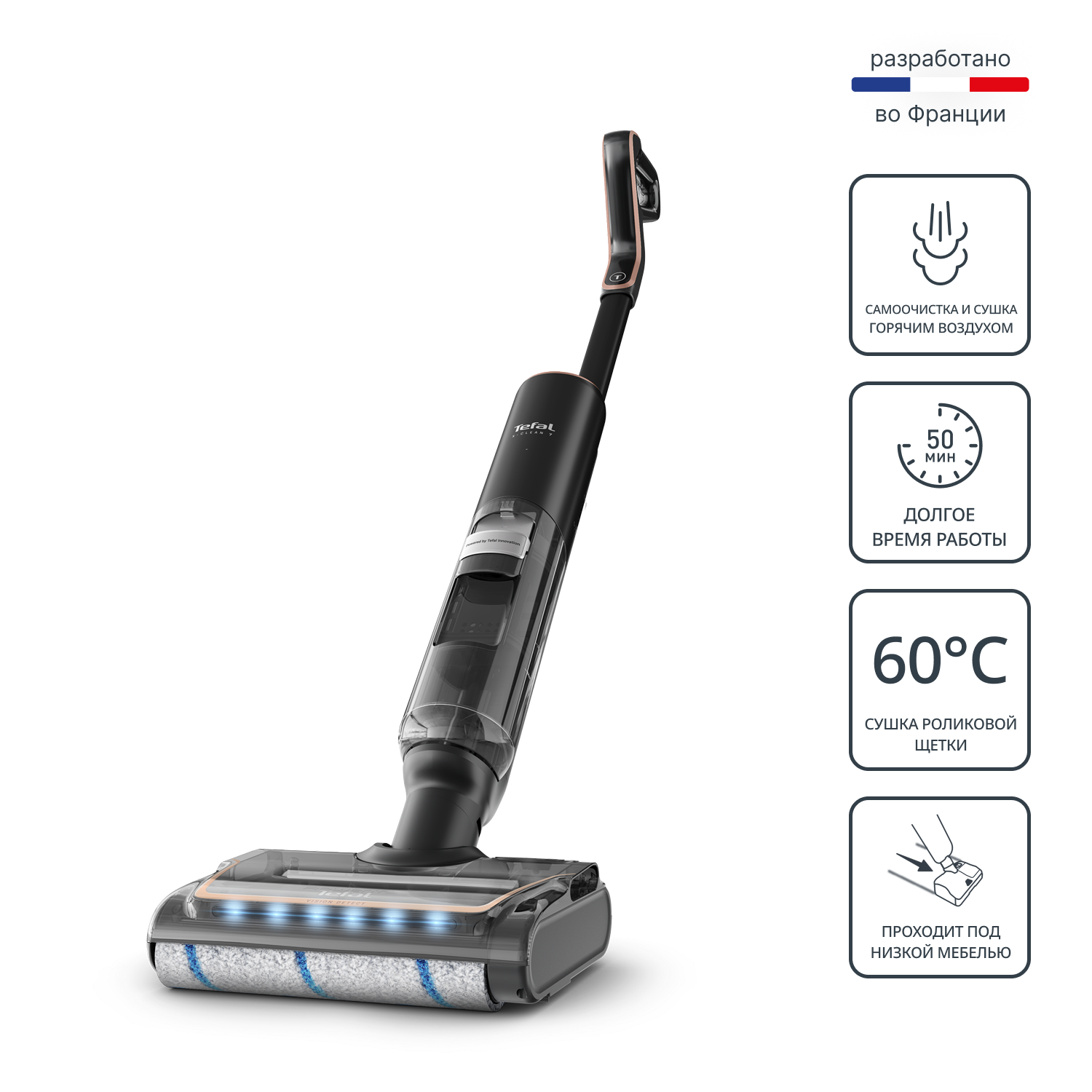Моющий пылесос Tefal X-Clean 7 GF5736F4 2в1 — это идеальный выбор для тех, кто ценит чистоту и функциональность в каждом движении. С его помощью можно не только быстро и эффективно убирать грязь с любых поверхностей, но и мыть полы, комбинируя две функции в одном устройстве. Этот стильный моющий пылесос отличается компактными размерами и высокой мощностью, что позволяет ему справляться с уборкой в любых условиях. Скорость работы роликовой щетки достигает 530 об/мин, что обеспечит вам качественную очистку даже самых сложных загрязнений. Устройство оснащено функцией автоматического распознавания степени загрязнений, благодаря чему вы можете быть уверены в том, что пылесос будет подстраиваться под условия уборки. X-Clean 7 2в1 имеет два резервуара: один для грязной воды объемом 500 мл и другой для чистой воды — 650 мл. В этих резервуарах можно использовать моющее средство для пола, что значительно облегчает уборку и делает ее более эффективной. С этим пылесосом уборка займет минимум времени — до 50 минут автономной работы на одном заряде аккумулятора, что позволяет очищать помещения площадью до 300 м². Особенностью модели является возможность самоочистки роликовой щетки горячим воздухом на зарядной станции при температуре 60°C, что позволяет поддерживать чистоту и долговечность устройства. Также, пылесос оснащен яркой LED-подсветкой, которая помогает обнаружить даже самые мелкие загрязнения. С Tefal X-Clean 7 2в1 уборка станет легкой и приятной, ведь его маневренность и продвинутая технология очистки позволят вам справляться с любой грязью за несколько минут, не прилагая усилий!