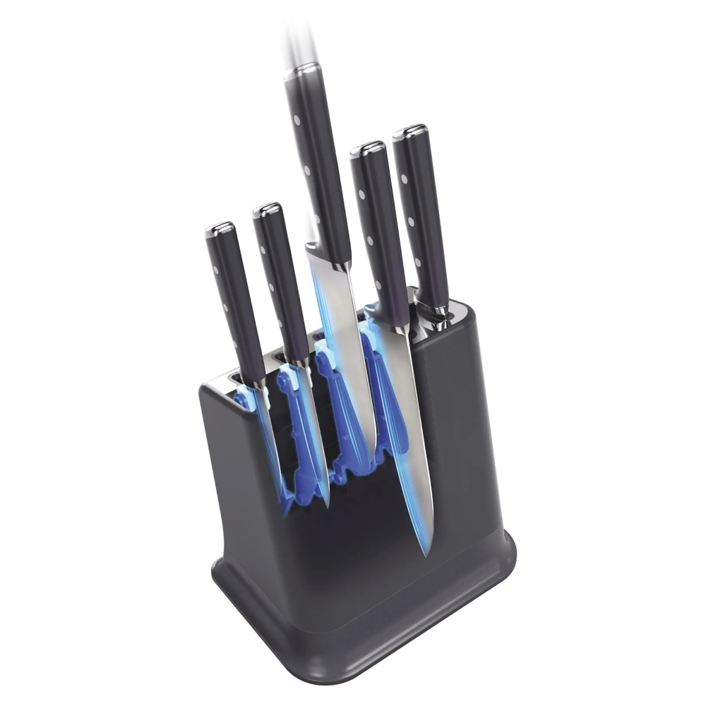 Шеф 20 см, Хлебный 20 см, Сантоку 16,5 см, Универсальный 12 см, Овощной 9 см, подставка со встроенной точилкой