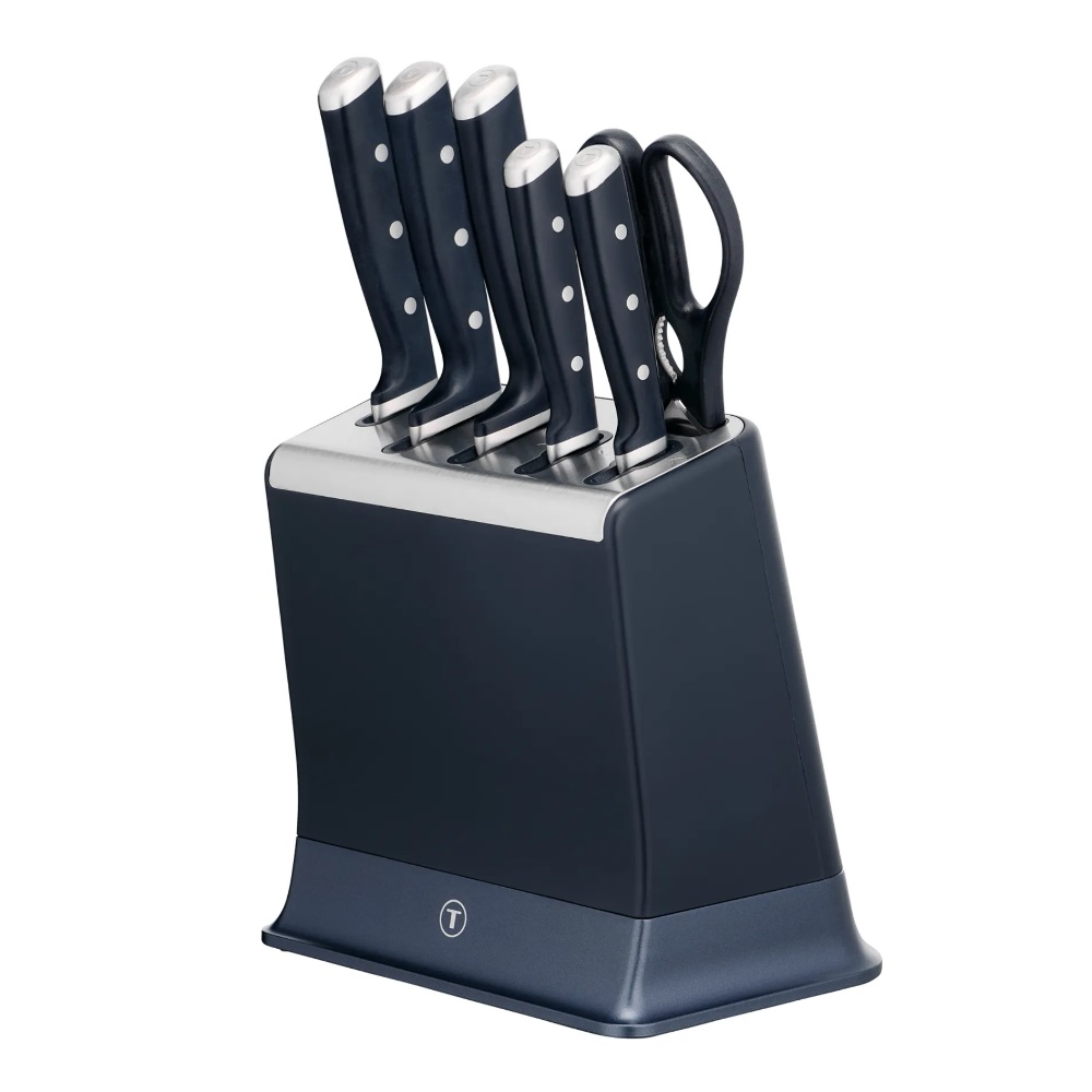 Шеф 20см, Хлебный нож с зубчатым лезвием 20 см, Нож сантоку 18см, Универсальный нож 12 см, Нож для чистки овощей 9 см , Ножницы + Блок