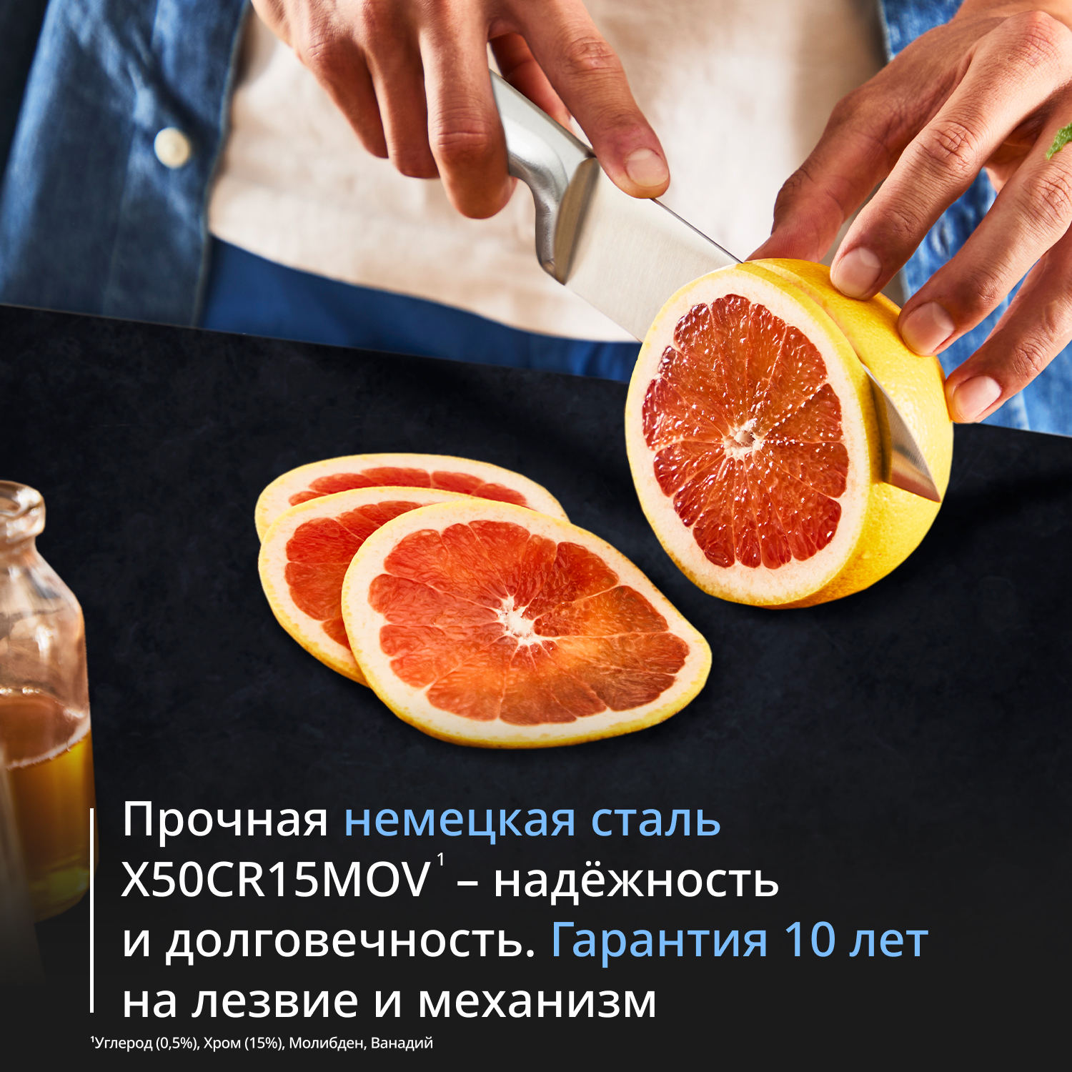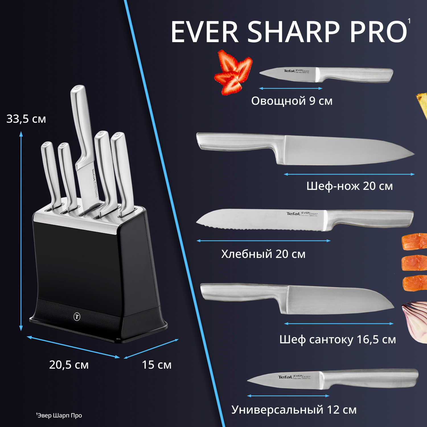 Безупречное качество нарезки ингредиентов день за днем, год за годом благодаря автоматической заточке ножей перед каждым использованием. Встроенная в блок для хранения запатентованная система заточки возвращает ножам идеальную остроту по всей длине лезвий. Просто вложите нож в слот блока после использования, и он станет острым без ваших усилий. Легкая заточка ножей в любом слоте блока для хранения (за исключением хлебного ножа с зубчатым лезвием). Безупречный результат при нарезке каждого ингредиента, от нарезанного шеф-ножом карпаччо из ананаса до нежного сашими из лосося, приготовленного ножом сантоку. Высококачественные лезвия из немецкой нержавеющей стали обеспечивают невероятную прочность, устойчивость к коррозии и долговечную остроту ножей. Полный контроль и точность: идеально сбалансированные ножи с эргономичными рукоятями и защитой от порезов.