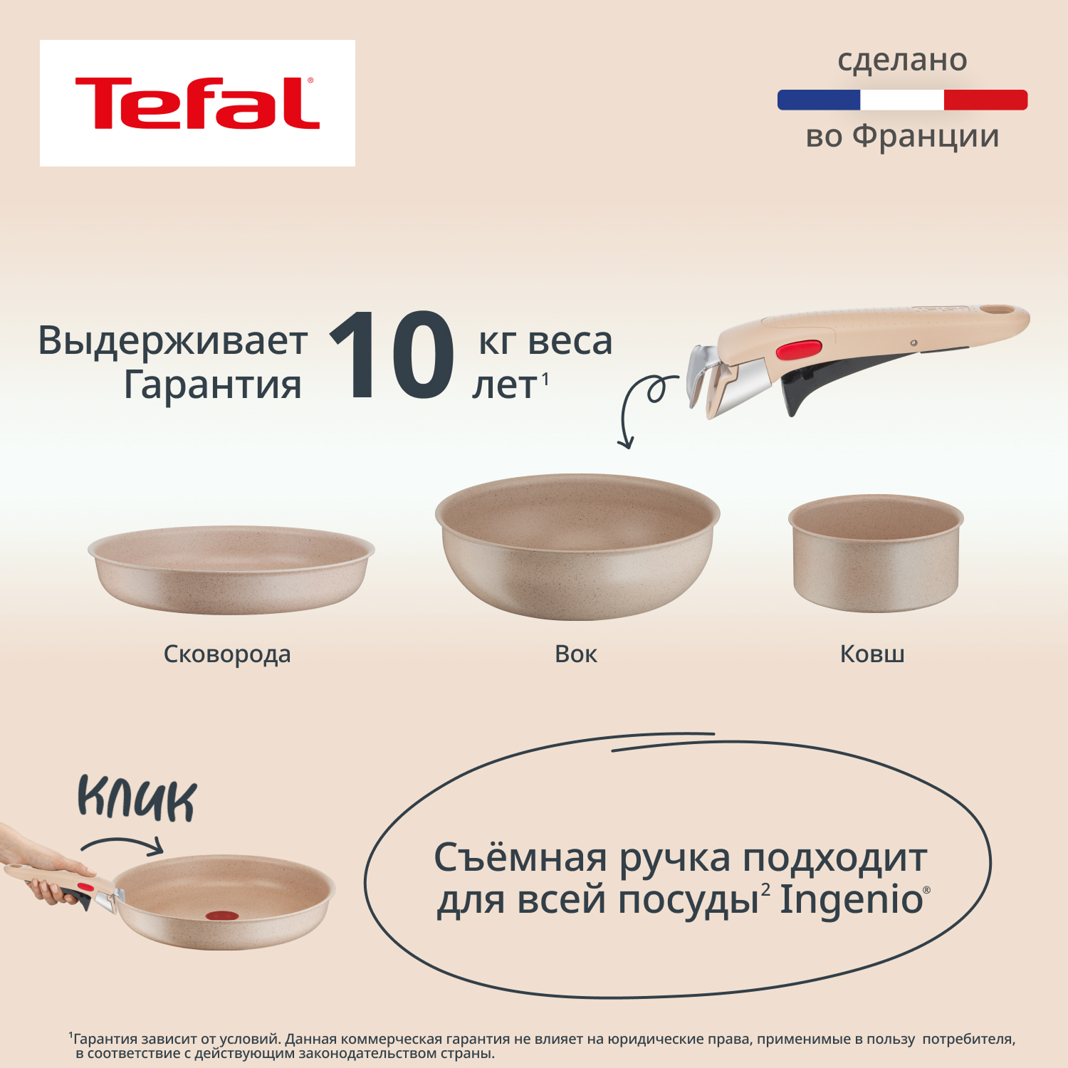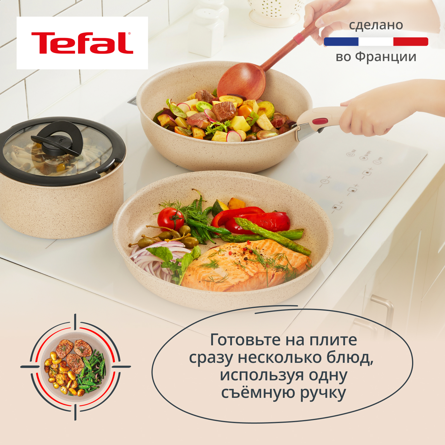 Набор посуды Tefal Ingenio Delight Cookware Set L7839522 представляет собой идеальное сочетание функциональности и стиля для вашей кухни. Изготовленный из переработанного алюминия, этот набор посуды совместим с различными типами плит, включая индукционные, газовые, электрические и керамические, что позволяет вам готовить на любом типе поверхности. Он также подходит для использования в духовке, за исключением ручек и крышек, что делает его ещё более универсальным. Антипригарное покрытие Minerallia+ и отсутствие PFOA делают кастрюли и сковороды безопасными и долговечными. Этот набор позволяет вам готовить с комфортом, как настоящий шеф, с применением современных технологий, таких как Advanced Induction Technology, которая обеспечивает эффективное распределение тепла по стенкам посуды для кухни. Кухонный набор для приготовления выполнен в стильном бежевом глиняном цвете с отделкой "Лунный свет" и оснащен съемной ручкой для удобства хранения и использования. Каждое изделие из набора имеет край для легкого слива, что добавляет дополнительное удобство при готовке. А удобный размер и практичность делают набор Тефаль отличным выбором для приготовления различных блюд, от простых до более сложных. В комплект входят: ковш 18 см, сковородка 28 см, сковорода вок 26 см, стеклянная и пластиковая крышка 18 см и съемная ручка. Произведенный во Франции, этот набор сочетает высокое качество и современные технологии, делая каждый процесс приготовления пищи приятным и легким. Готовьте с удовольствием и уверенностью, как настоящий шеф вместе с металлическим набором посуды со съемной ручкой Ingenio Delight Cookware Set от Tefal!