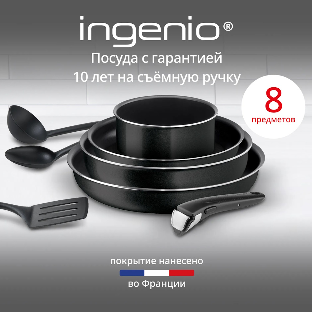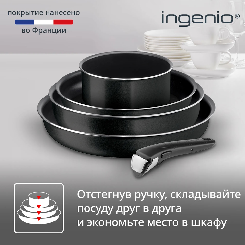Набор посуды со съемной ручкой Tefal Ingenio 4250830 – это отличное решение для кухни, сочетающее в себе многофункциональность, удобство хранения и долговечность. Набор посуды Tefal Ingenio прекрасно подойдет для совершенствования вашего кулинарного мастерства. Благодаря прочному дну, изготовленному по технологии Durabase, посуда подойдет для всех типов плит, кроме индукции. Антипригарное титановое покрытие “Titanium“ обеспечивает отличные антипригарные свойства и повышенную износостойкость даже при длительном и ежедневном использовании благодаря усовершенствованному верхнему слою. Компактная система хранения позволяет экономить до 50% пространства в кухонных шкафах, что особенно важно для небольших кухонь. Благодаря прочным материалам и продуманной конструкции, посуда прослужит долгие годы, а ее универсальность позволит вам легко экспериментировать с разными способами приготовления. С этим набором вам больше не придется искать компромисс между удобством и функциональностью – он обеспечит идеальный кулинарный опыт каждый день. В него входит 8 предметов: сковороды 24/26/28см, ковш 16 см, лопатка, половник, поварская ложка и съемная ручка. Tefal Ingenio создан для того, чтобы сделать процесс готовки максимально простым и удобным!
