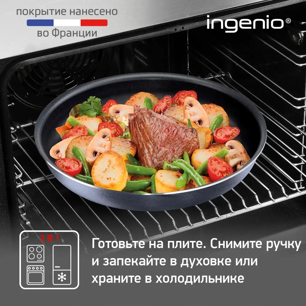 • Комплектация: Сковороды 22/26/28 см, ковши16/20см, толкушка, лопатка, половник, поварская ложка, а также съемная ручка Ingenio 6