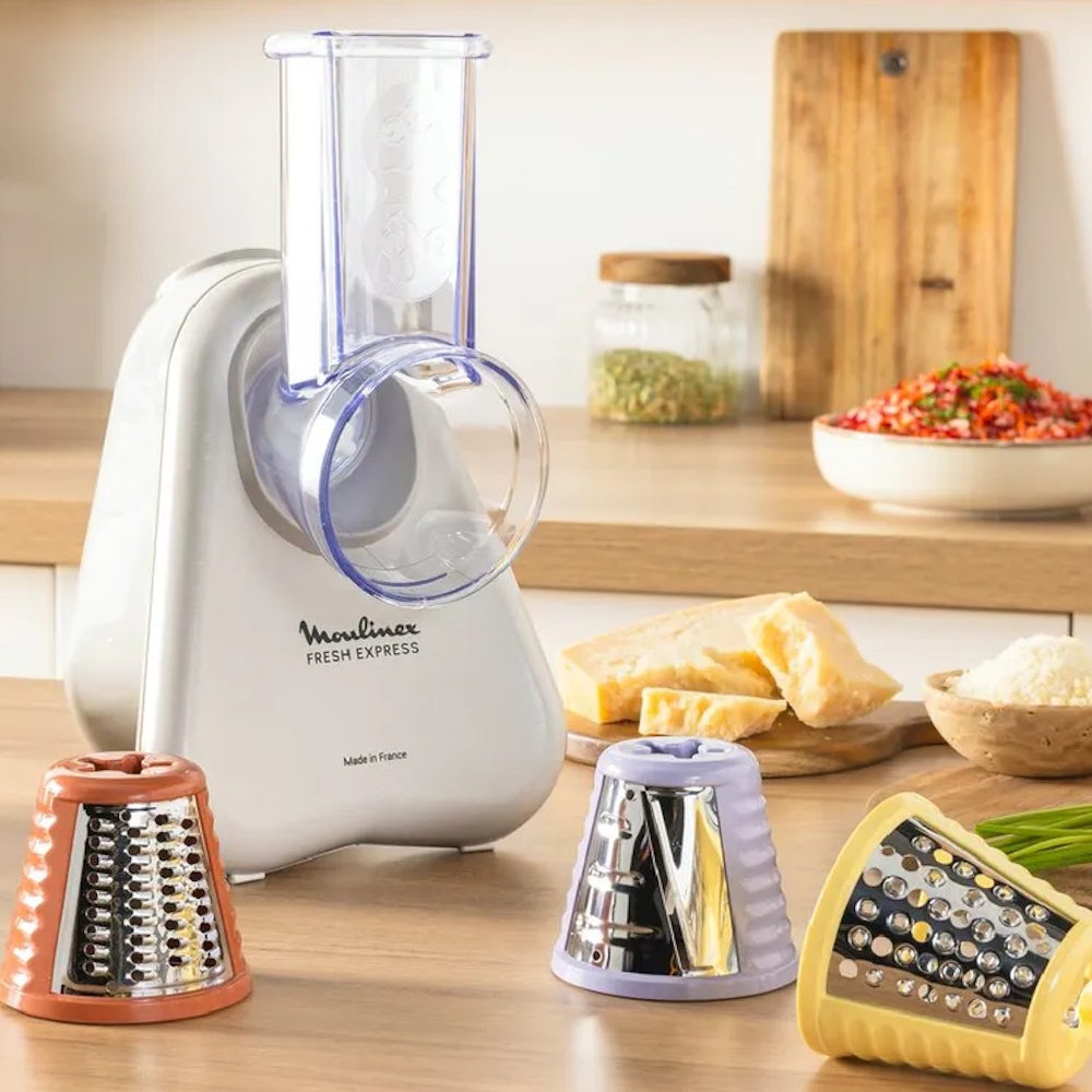 Овощерезка Moulinex Fresh Express DK853BF0 - это универсальный помощник на вашей кухне, который значительно ускорит и упростит процесс нарезки и подготовки овощей и фруктов. Благодаря 3-м взаимозаменяемым конусам — это ценный помощник в приготовлении пищи! — 1 конус для нарезки слайсов. — 1 специальный конус для пармезана. — 1 конус для тонкой нарезки. Простота установки, изменения и сохранения размера нарезки непосредственно на устройстве! Свеженарезанная или тертая еда попадает прямо в блюдо.