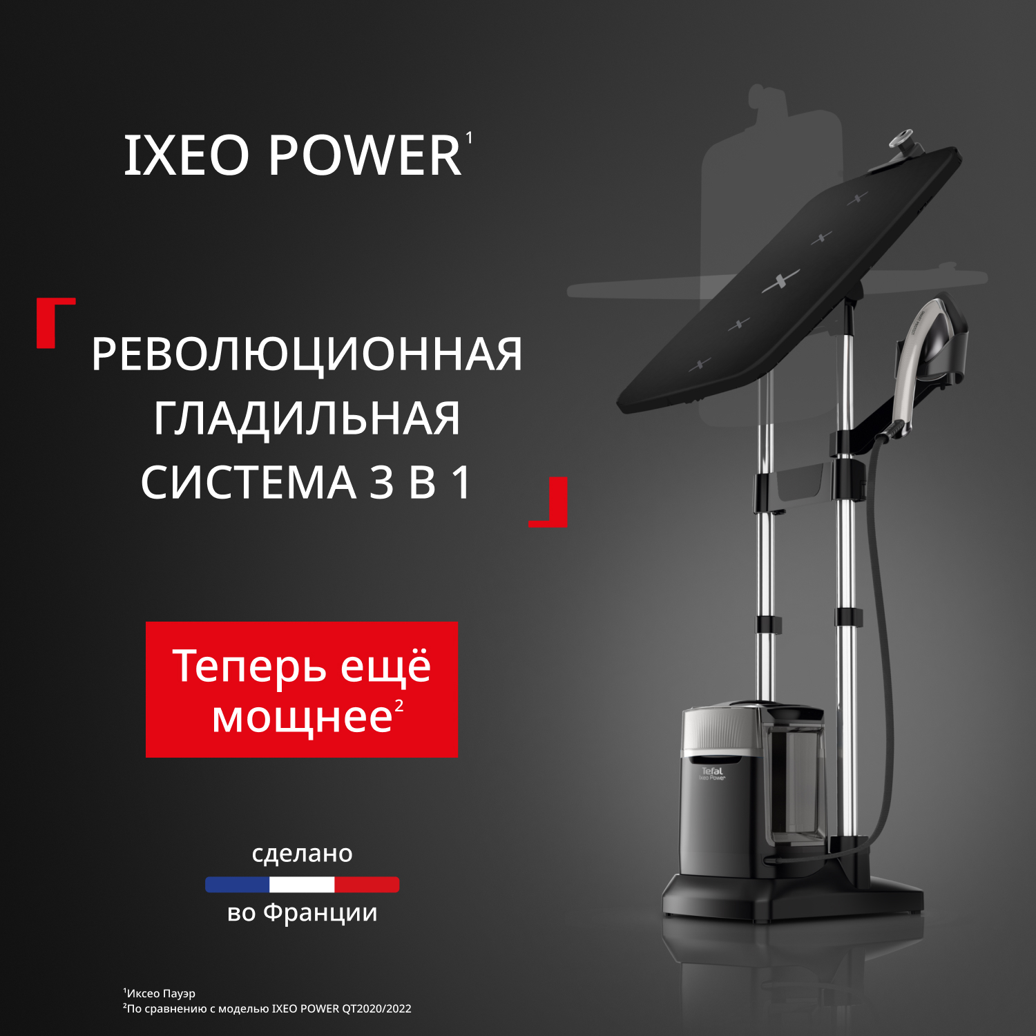 Паровая гладильная система Tefal IXEO Power QT2028F0 - революционная гладильная система 3 в 1. Мощный постоянный пар до 100 г/мин, давление насоса 5,8 бар, паровой удар до 350 г/мин для мгновенного разглаживания стойких складок и три уровня мощности пара для любых типов тканей.