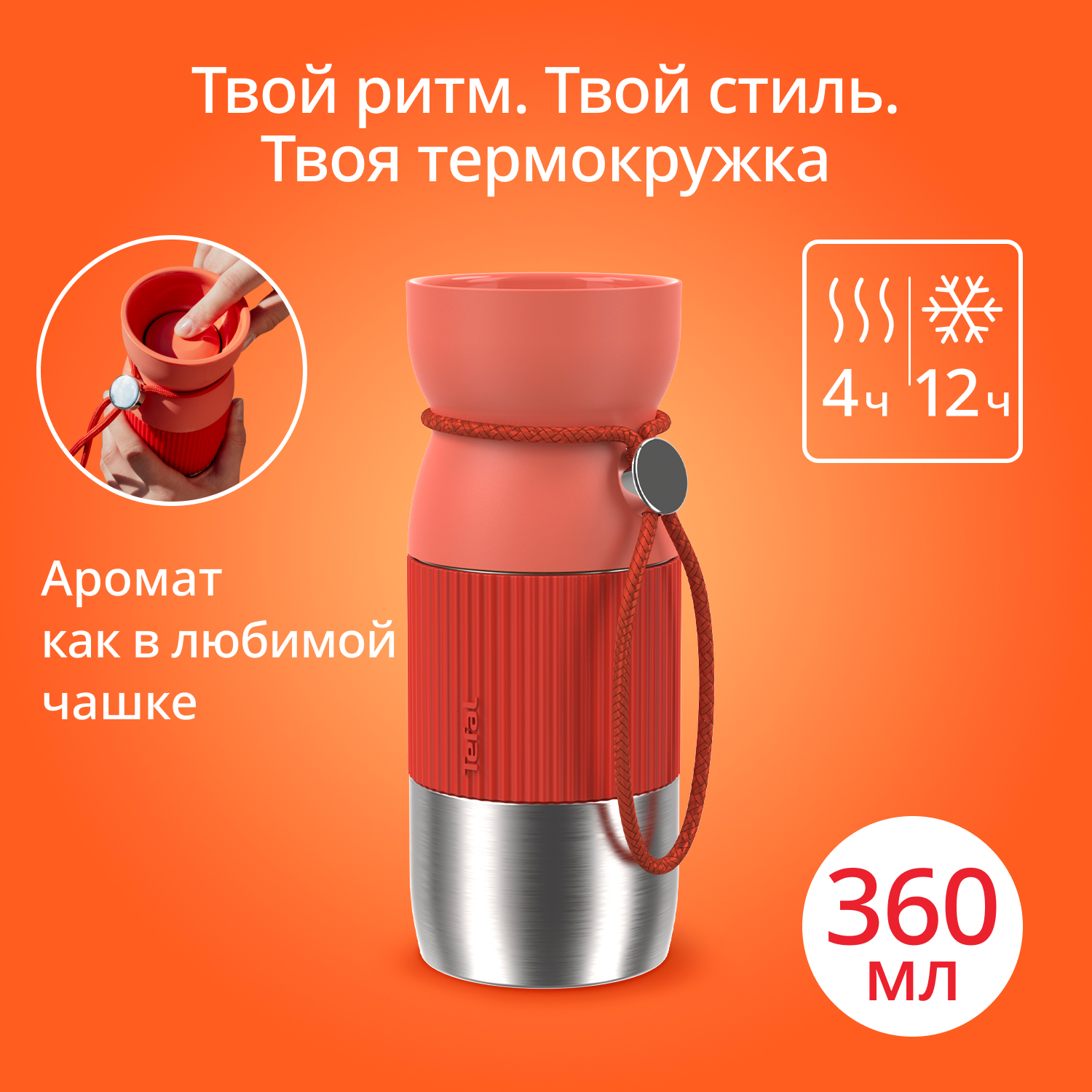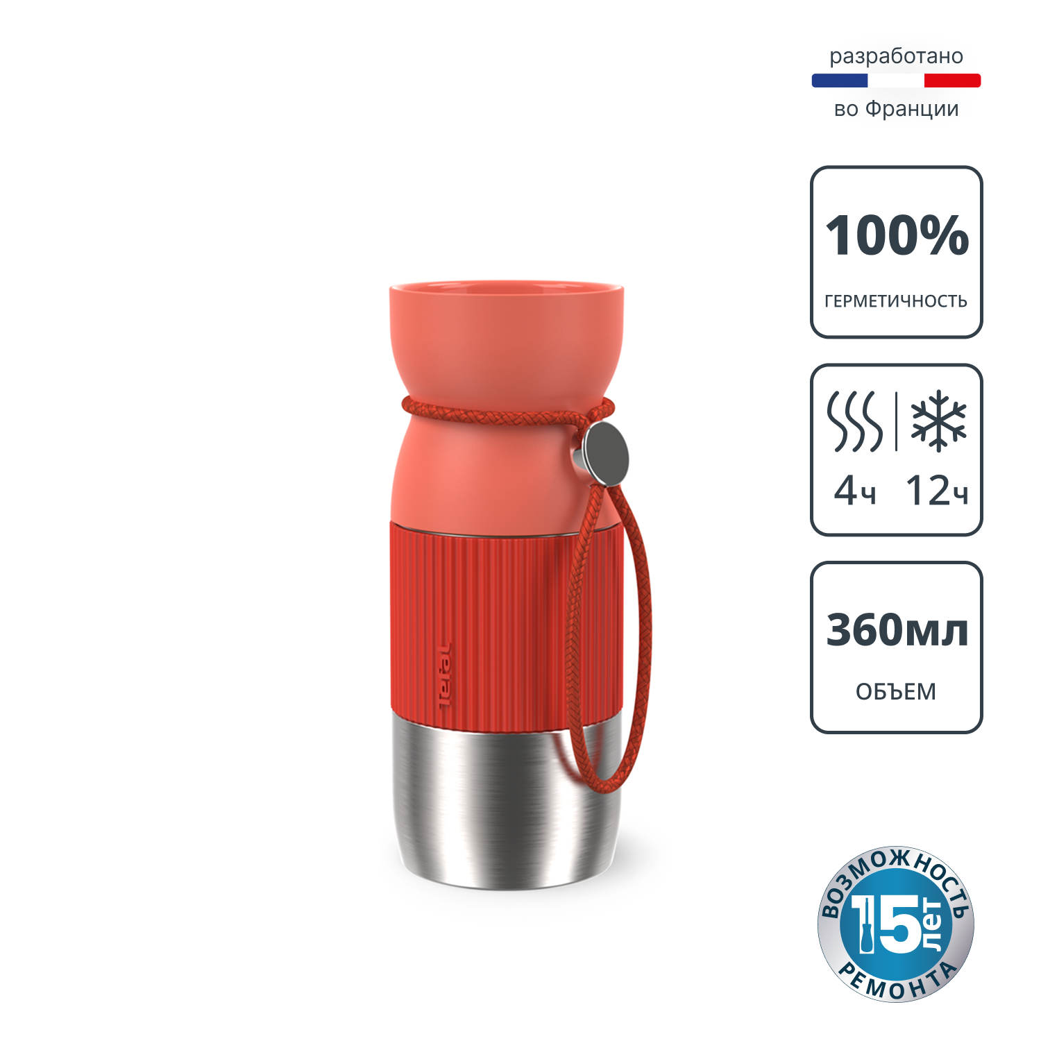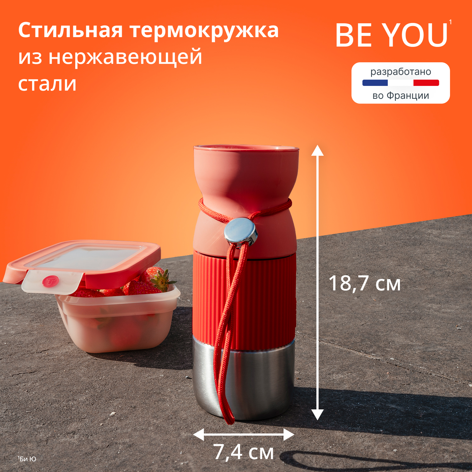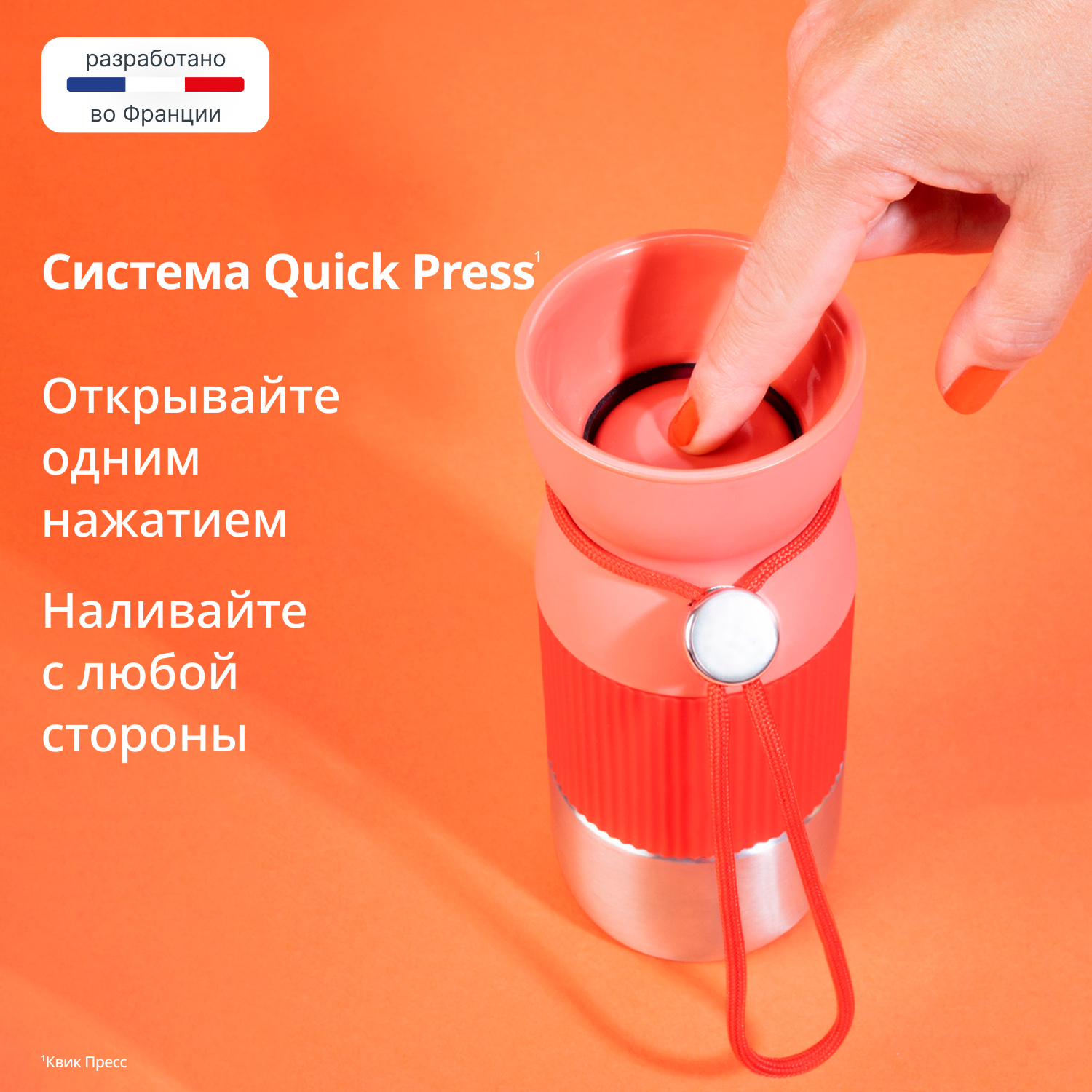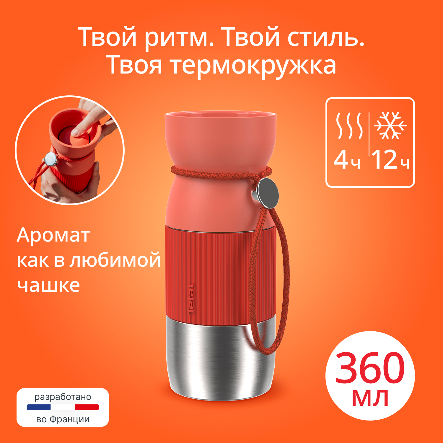 Возьмите с собой термокружку, куда бы вы ни отправились! Наша стильная термокружка идеальна тех, кто предпочитает активный образ жизни: ее корпус на 100% герметичен, поэтому вы можете смело положить ее в вашу сумку и отправиться навстречу новому дню. Чашеобразная крышка термокружки комфортно открывается одной рукой нажатием на кнопку и позволяет наслаждаться ароматом любимого напитка как из классической чашки. Потрясающая термоизоляция надолго сохраняет температуру напитков внутри: горячий кофе остается горячим, а чай со льдом не теряет свою освежающую прохладу.