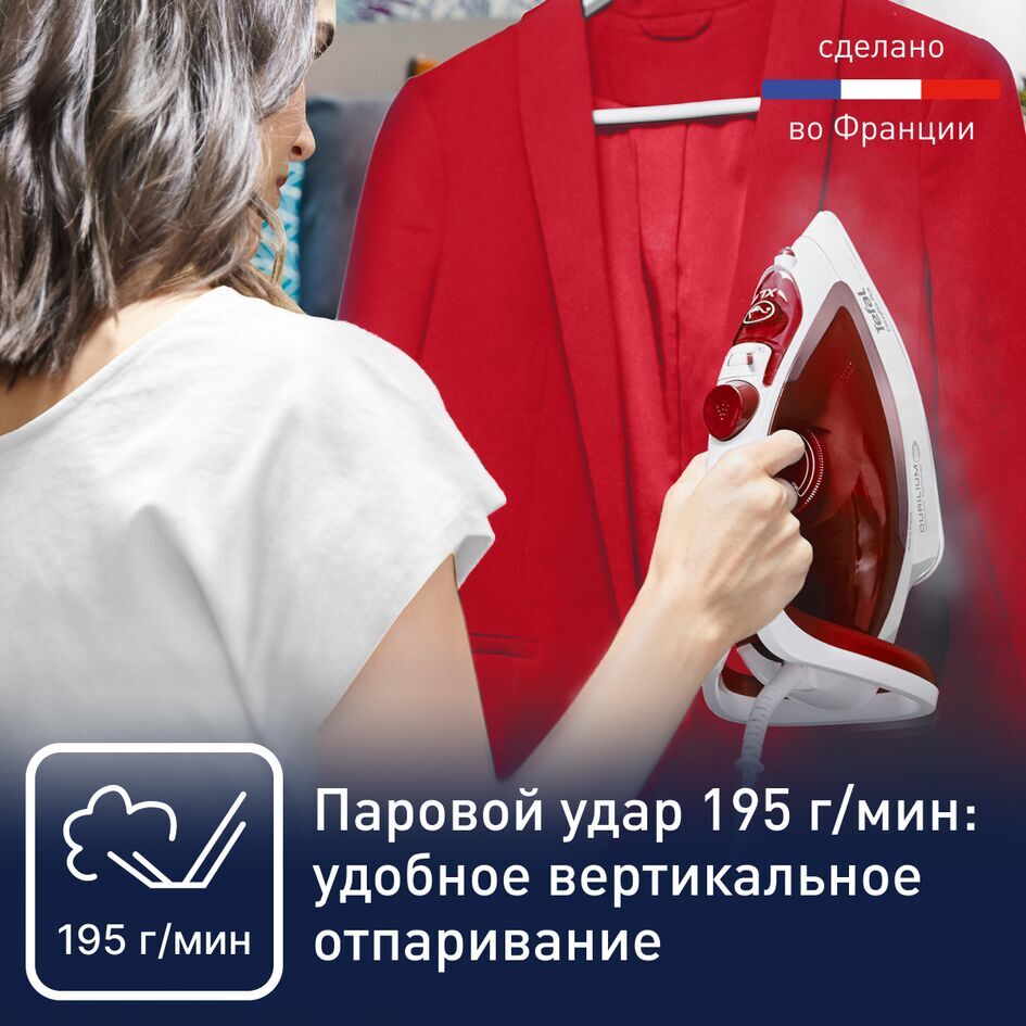 Эта функция позволяет гладить одежду на вешалке и в других подобных условиях.Для этого установите регулятор температуры утюга на максимум.• Повесьте предмет одежды на вешалку и аккуратно придерживайте ткань одной рукой.• Нажимая и отпуская кнопку управления паром, перемещайте утюг сверху вниз.Так как пар очень горячий, он смягчает ткань и разглаживает складки.Примечание. Запрещается использовать функцию «вертикальный пар» для глажки одежды на человеке.